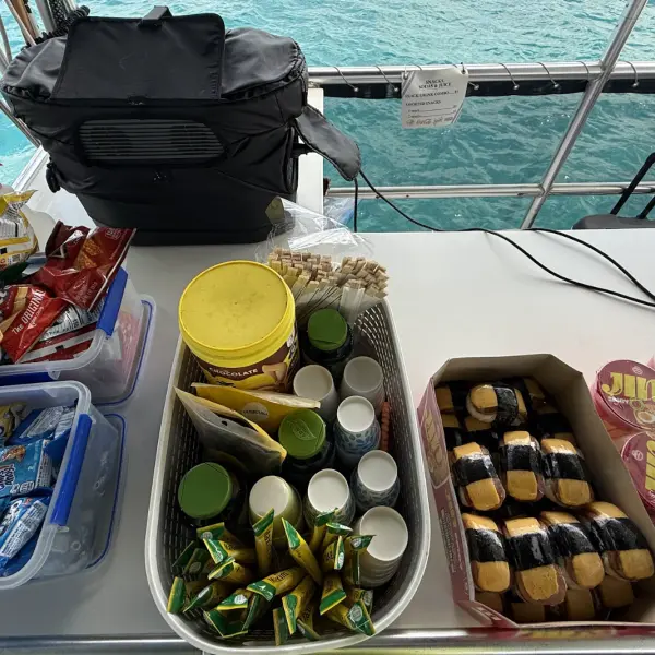 신나는 물놀이 후 즐기는 선상 간식 타임! 라면, 무스비, 스낵 등이 준비되어있습니다. 마음껏 즐겨보세요.